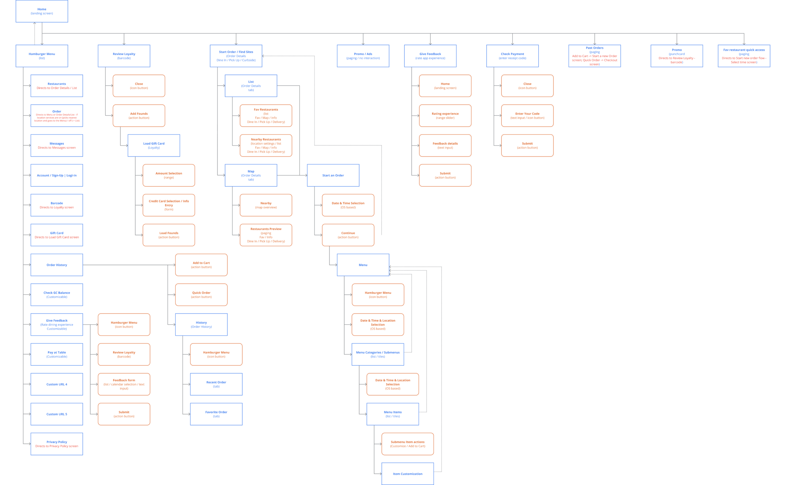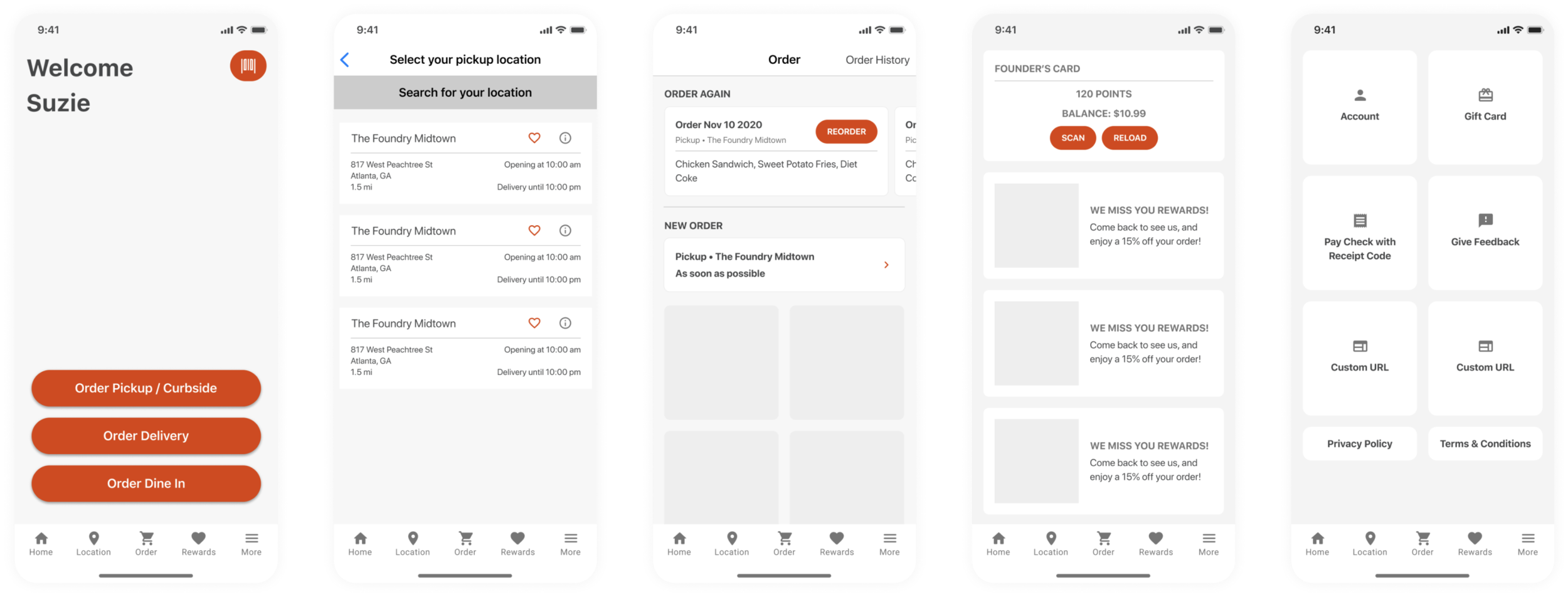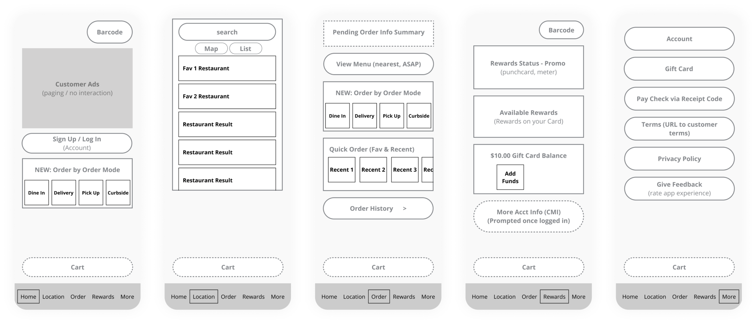 We started the app wireframing with blocks of contents to get a sense of the essential sections and their complexity. Compared with the current App, the main functions are directly listed as navigation tabs for different use cases. We decrease the contents on the homepage so that the customers will have more flexibility for branding and advertising, “Start your order” is also emphasized.