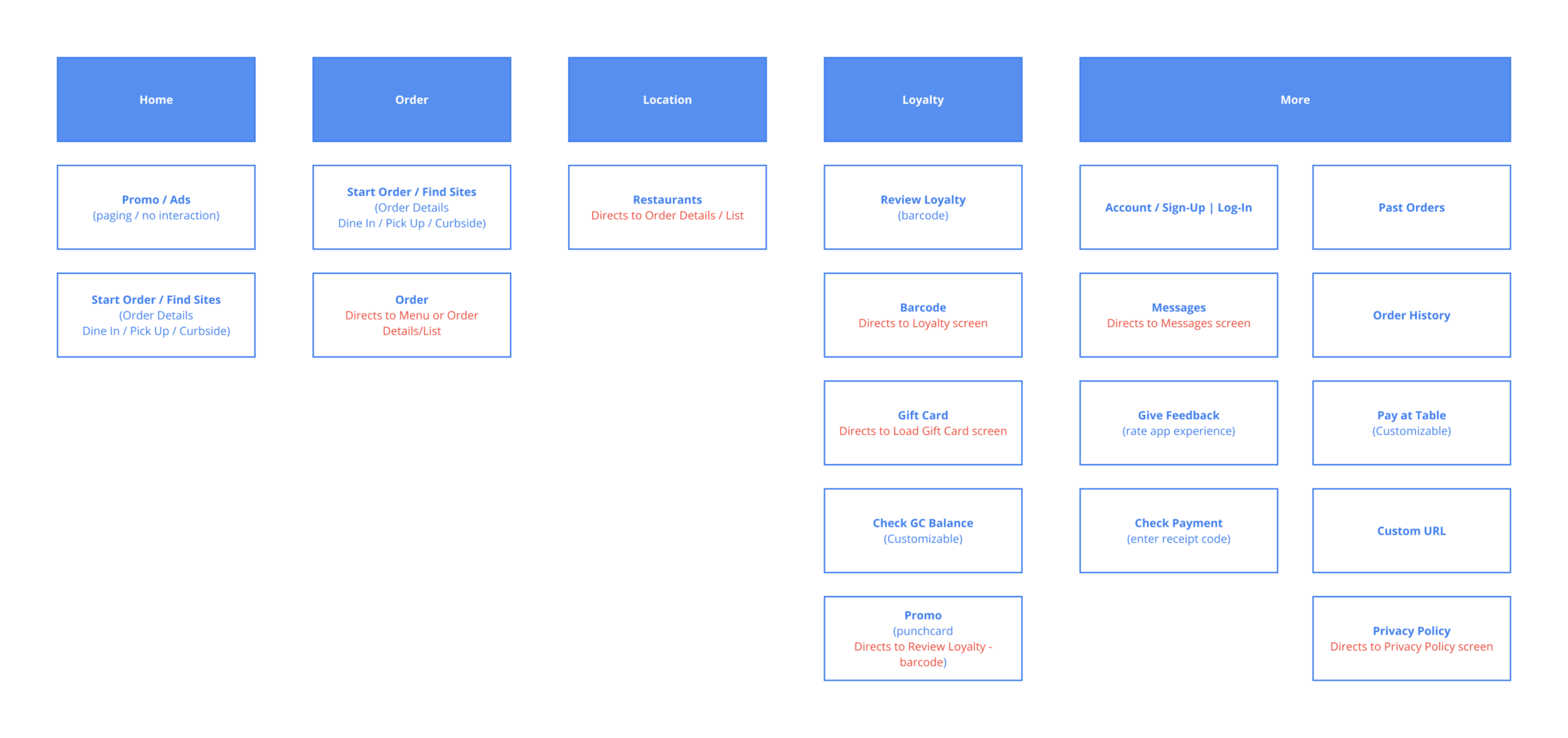 After several rounds of discussion and iteration, we finalized the groups - also worked as the navigation tabs as Home, Order, Locations, Loyalty and More.