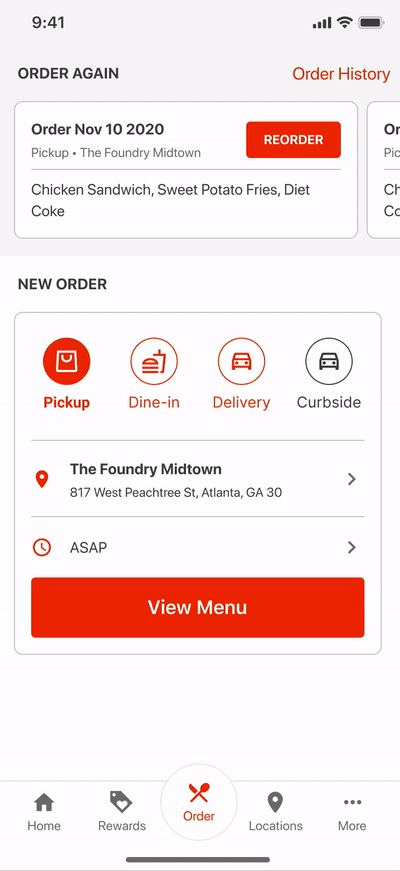 Ordering page is the most important and profitable feature for Digital Ordering App, and we hope to provide a quick and easy experience for users to start their order. Instead of guiding the users to select order method, location and time, we provide a default value based on most common selection and user’s nearest location.